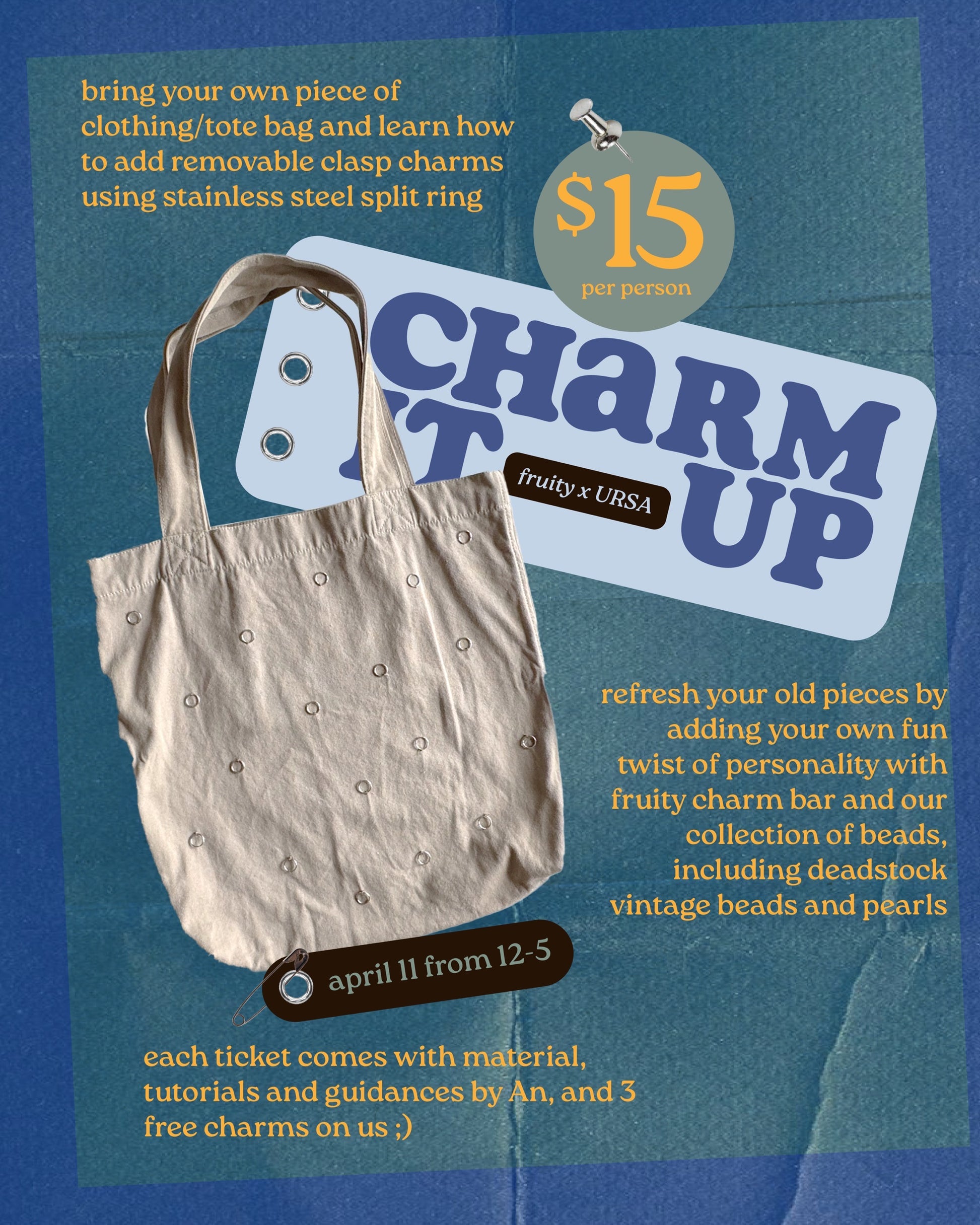 you're invited to fruity pop-up at URSA 🥰! We are bringing our lively charms bar with the additional service to ✨CHARM IT UP! ✨aka bring your own tote, fabric bag, clothing item that needed a refresh or missing that bling personality! We will help/guide you sew on the stainless steel split rings and attach the collective of charms with clasps! 🙌.